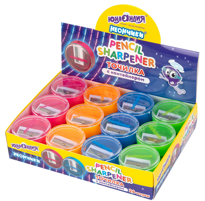 Точилка пластик 1отв. с контейнером «шарик неон» цвет неон, 40х40х17 мм, 1, юнландия