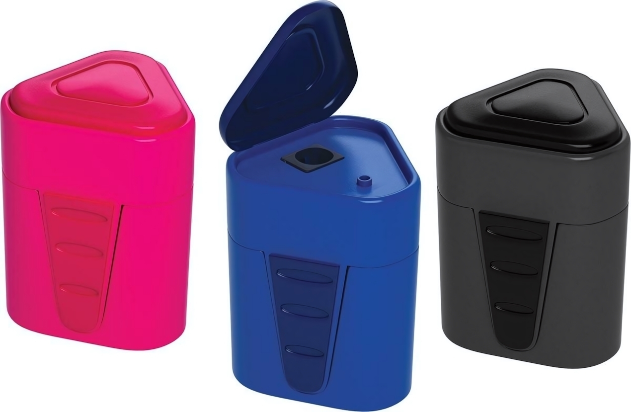 - Яркий дизайн: представлена в различных цветах (розовый, синий, черный), что позволяет выбрать точилку по своему вкусу.