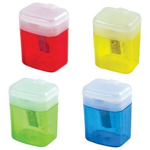 Размер точилки — 34×21×27 мм. Цвета корпуса — яркие варианты в ассортименте: красный, жёлтый, зелёный или синий. Отгружается один товар, цвет определяется случайным образом.