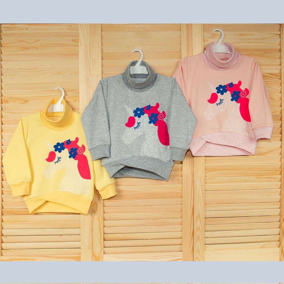 Толстовка представлена в трех модных расцветках: нежно-розовой, жизнерадостной желтой и классической серой. Принт единорога с цветами добавляет изделию игривости и делает его любимой одеждой вашей малышки.