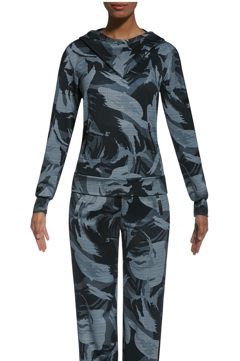 Топ изготовлен из качественного материала: 85% полиэстер, 15% эластан. Такое сочетание обеспечивает долговечность, сохранение формы и необходимую растяжимость. Стильный серый камуфляжный принт делает эту модель универсальной и современной. Рекомендуется бережная стирка согласно инструкции на ярлыке изделия для сохранения его свойств и цвета.
