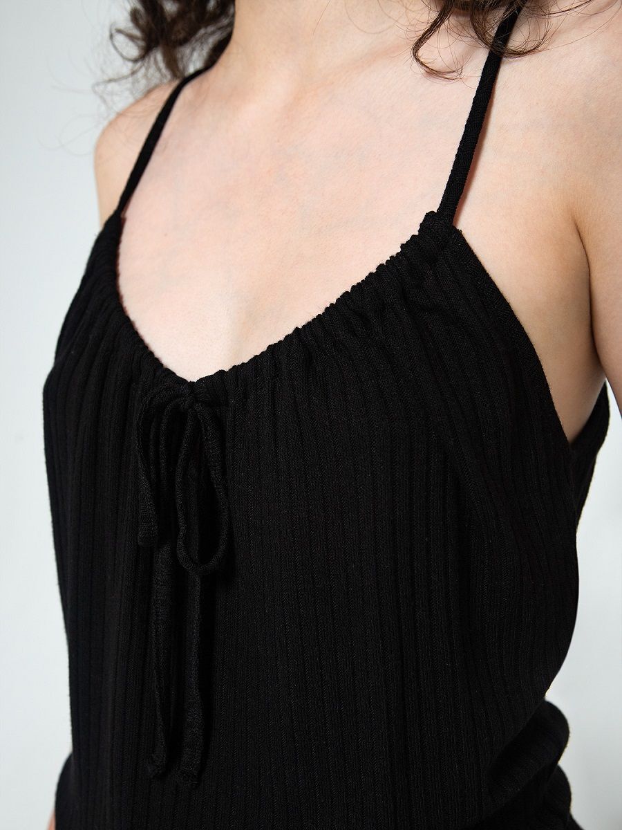 Свободный топ из мягкого вискозного трикотажа с ребристой текстурой — идеальный выбор для повседневной носки и домашнего уюта. Регулируемая завязка на груди создаёт индивидуальную посадку, а тонкие бретели подчеркивают женственность силуэта.