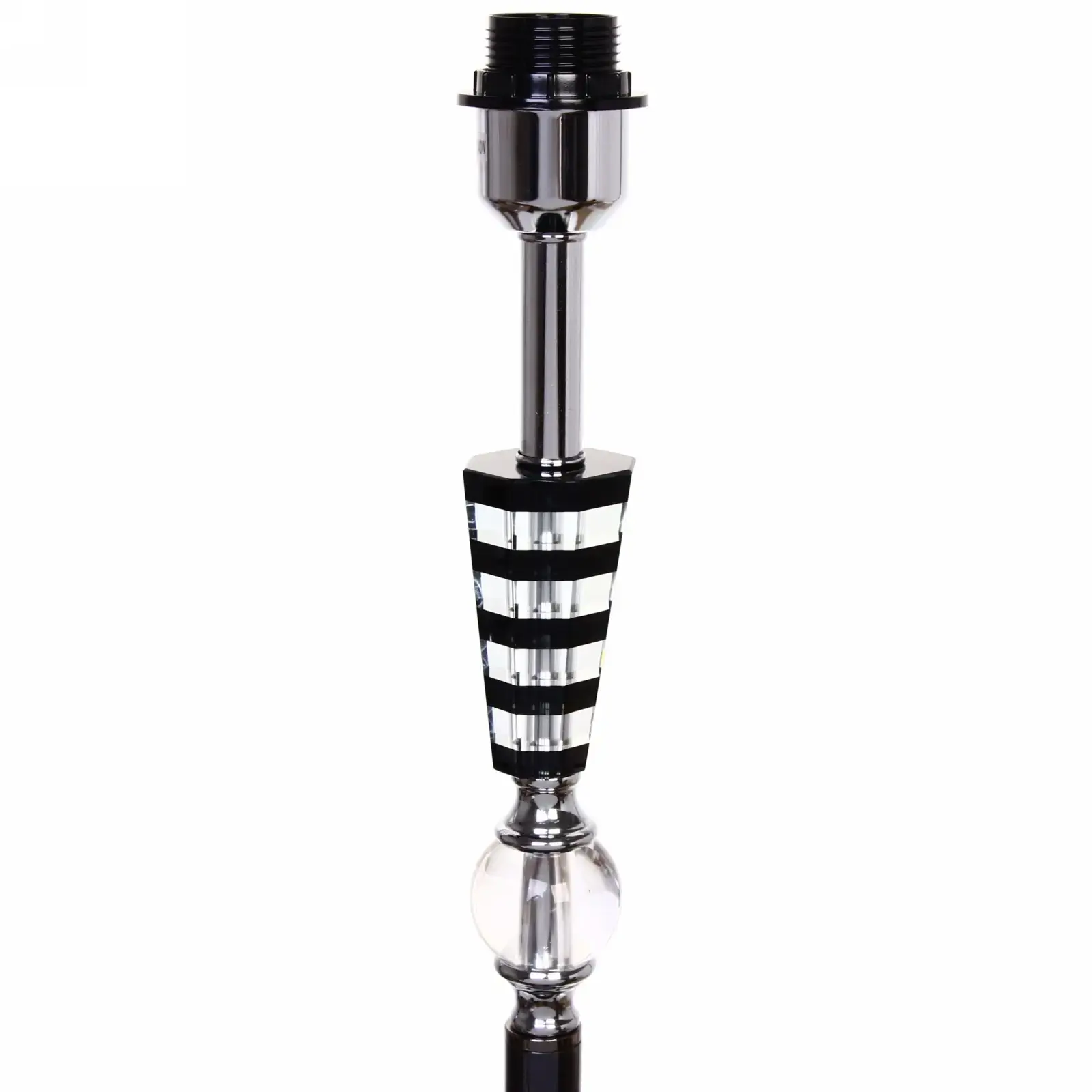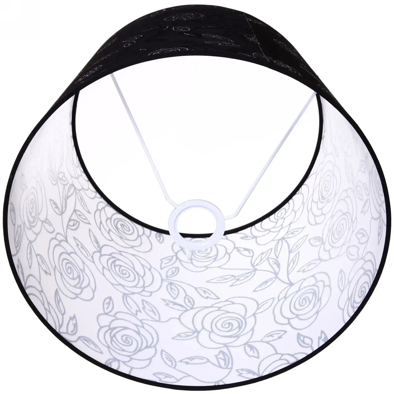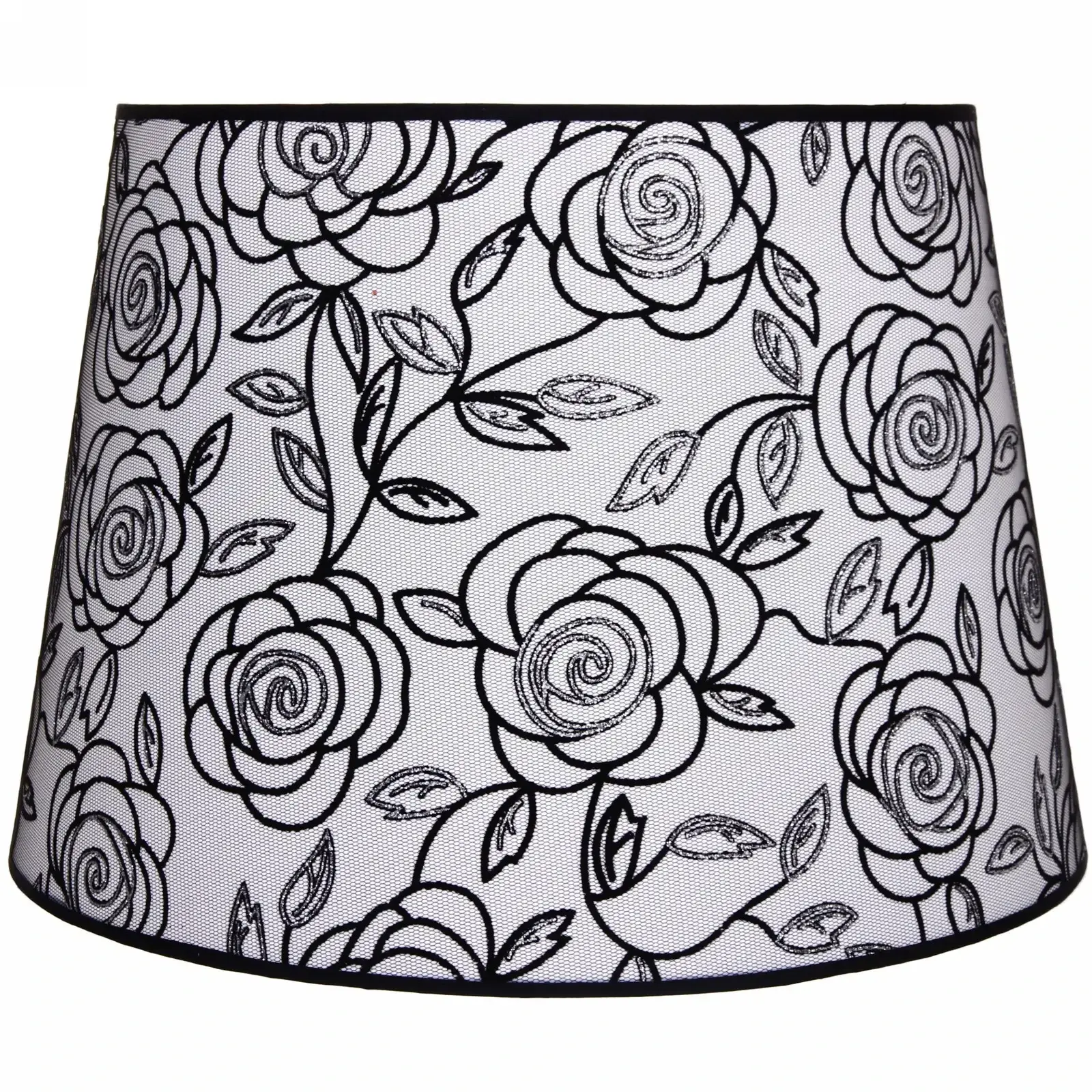 Абажур конической формы выполнен из текстильного материала и украшен утонченным чёрно-белым узором крупных роз. В конструкции используется прозрачный декоративный элемент, придающий дизайну легкость. Округлое основание дополняет лампу, делая её устойчивой и визуально завершённой. Черная глянцевая отделка подчеркивает благородство исполнения и современный стиль.