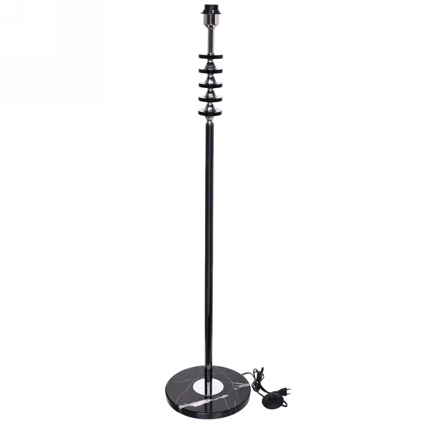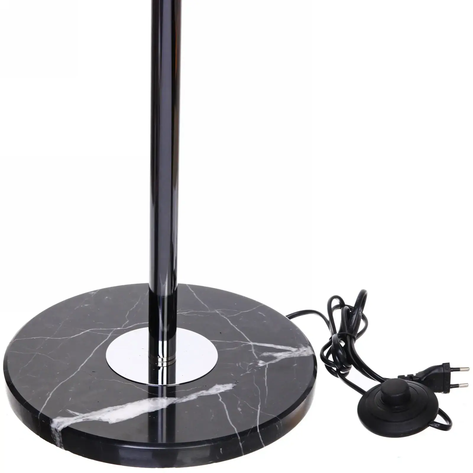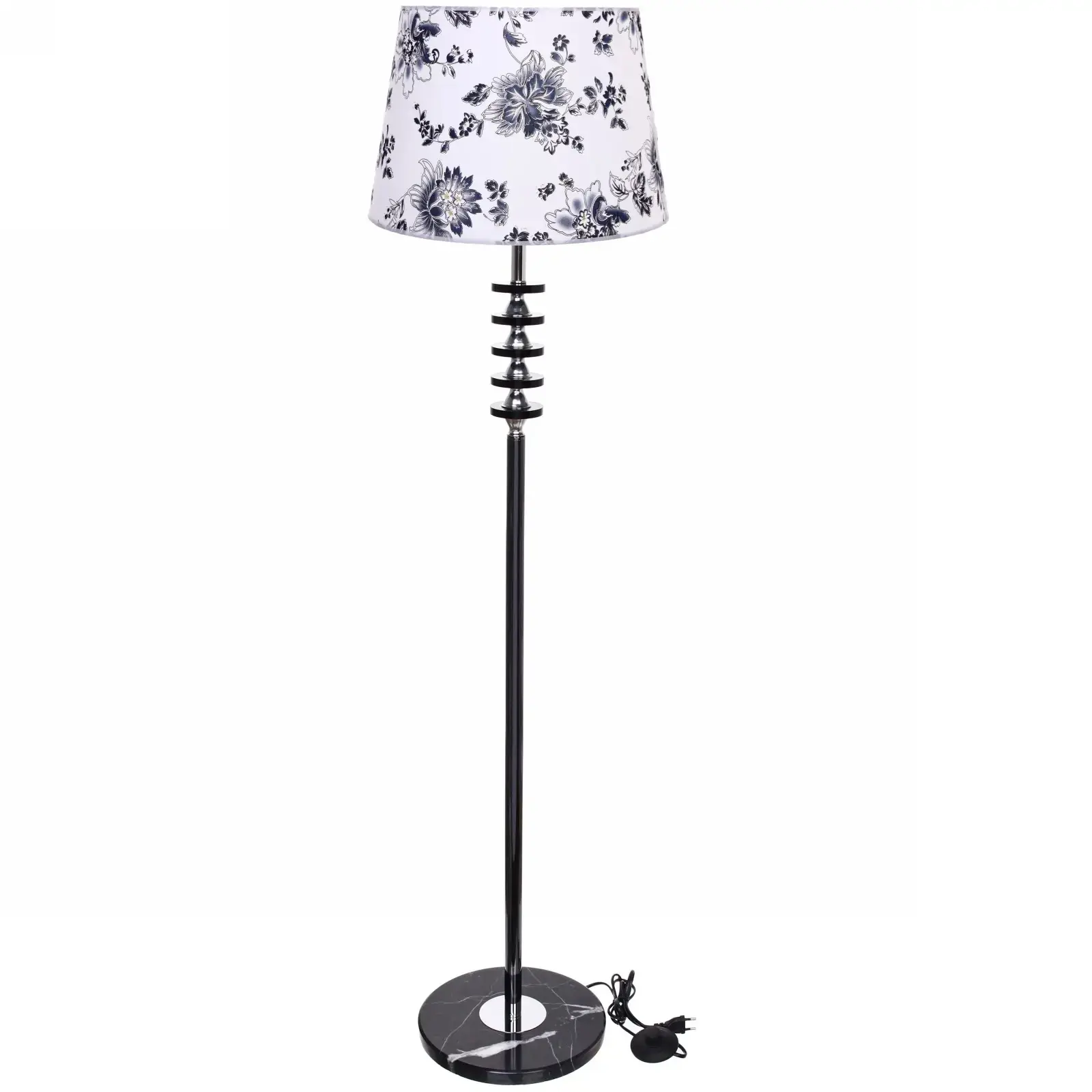 Металлический корпус в черном цвете с глянцевой отделкой сочетается с белым текстильным абажуром, украшенным изящным цветочным рисунком. Мраморное основание с черно-белым узором добавляет торшеру стабильности и эстетики. Подключение осуществляется через стандартный разъем Е27.