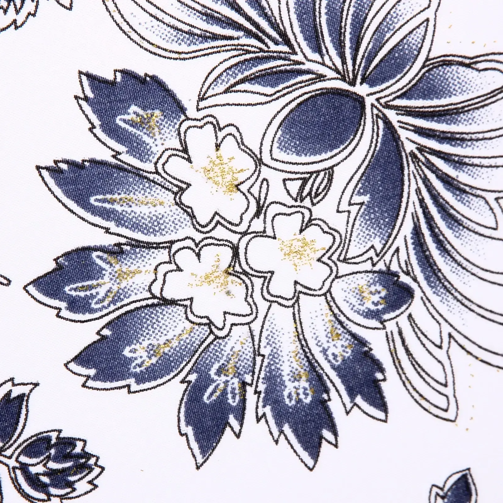 Материалы: металл с антикоррозийным покрытием, плотный текстиль абажура. Цветовая гамма: бронзовые элементы, белый фон абажура с контрастным цветочным узором.