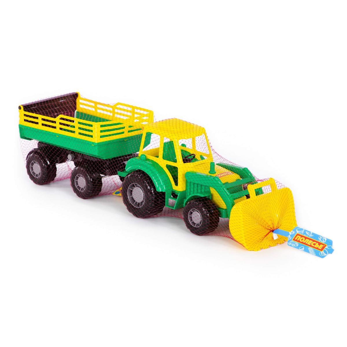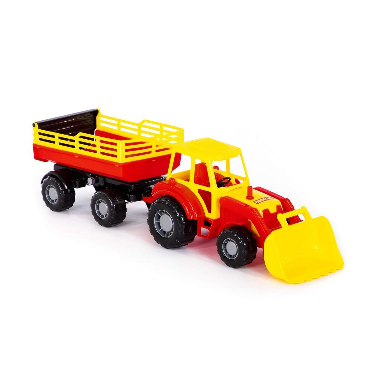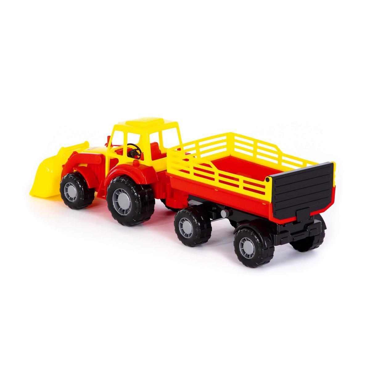 Материал: высококачественный пластик, цвета модели — красный и жёлтый. В комплекте один трактор с подвижным ковшом и один прицеп. Игрушка реализована в точном соответствии с уменьшёнными копиями сельскохозяйственной техники.