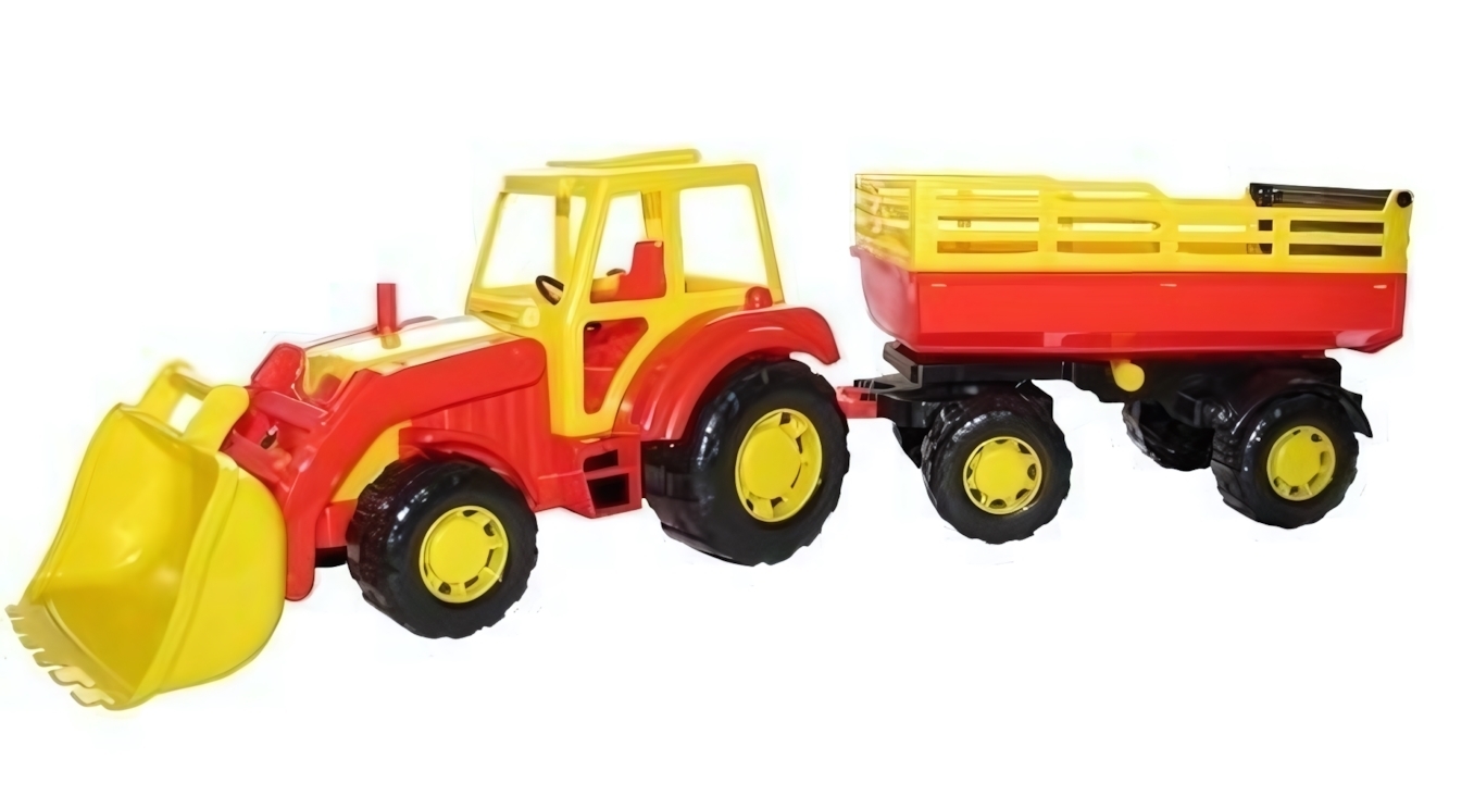 Трактор снабжён вместительным прицепом, который легко отсоединяется и присоединяется, а фронтальный ковш поднимается, позволяя выполнять разнообразные игровые задачи: перевозить "груз", погружать и выгружать песок, строить воображаемые дороги или копать ямы. Модель отлично подходит для самостоятельной или групповой игры дома, на улице, в песочнице или на участке. Эргономичная форма и безопасные материалы делают игрушку доступной даже для малышей.