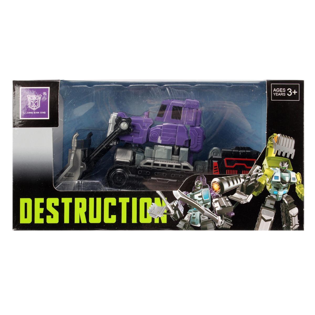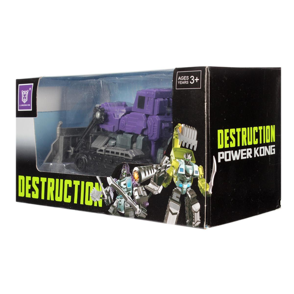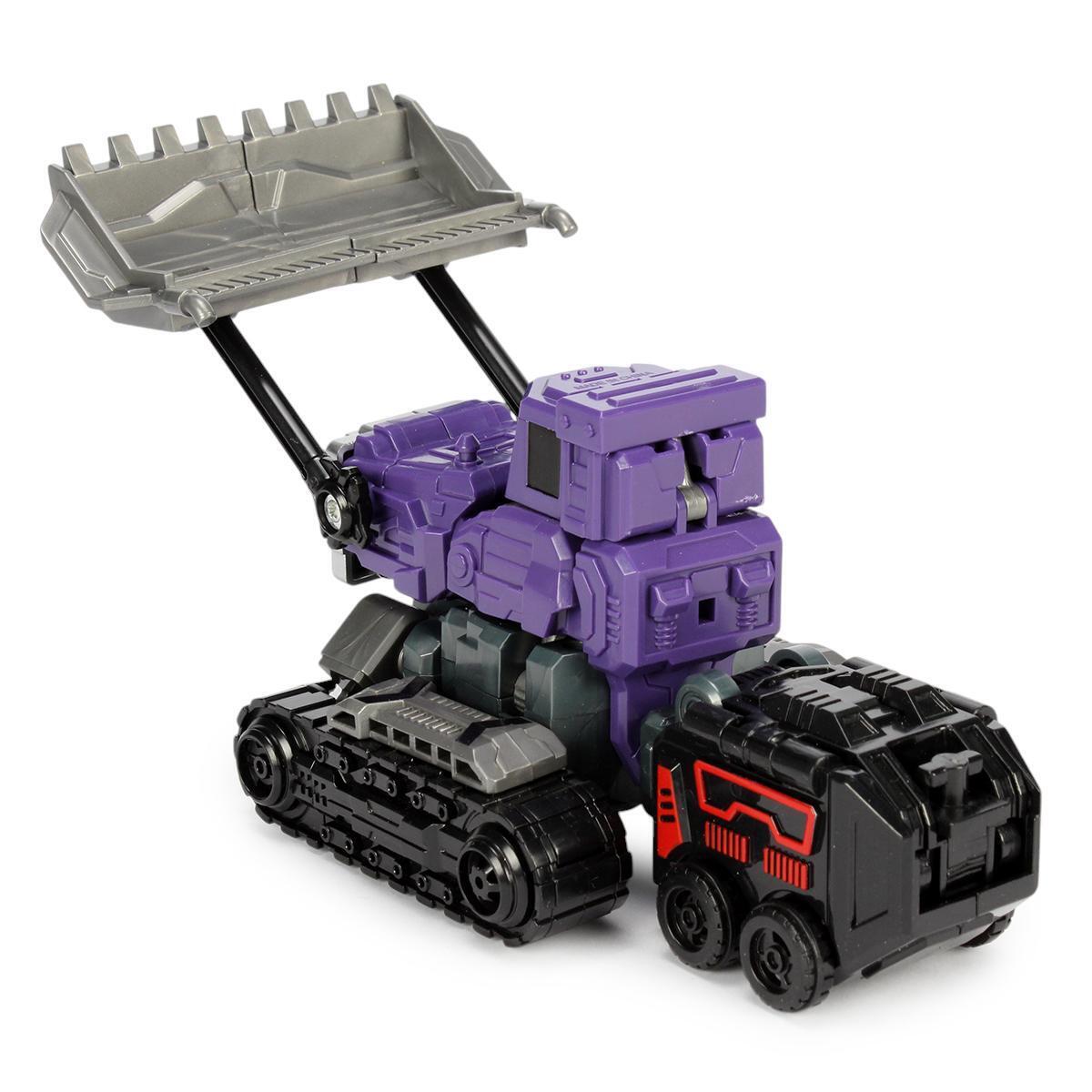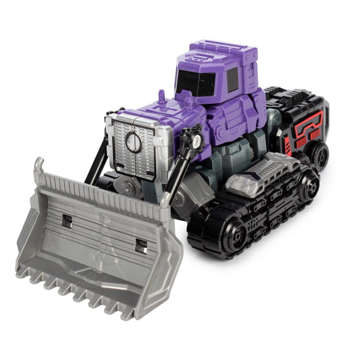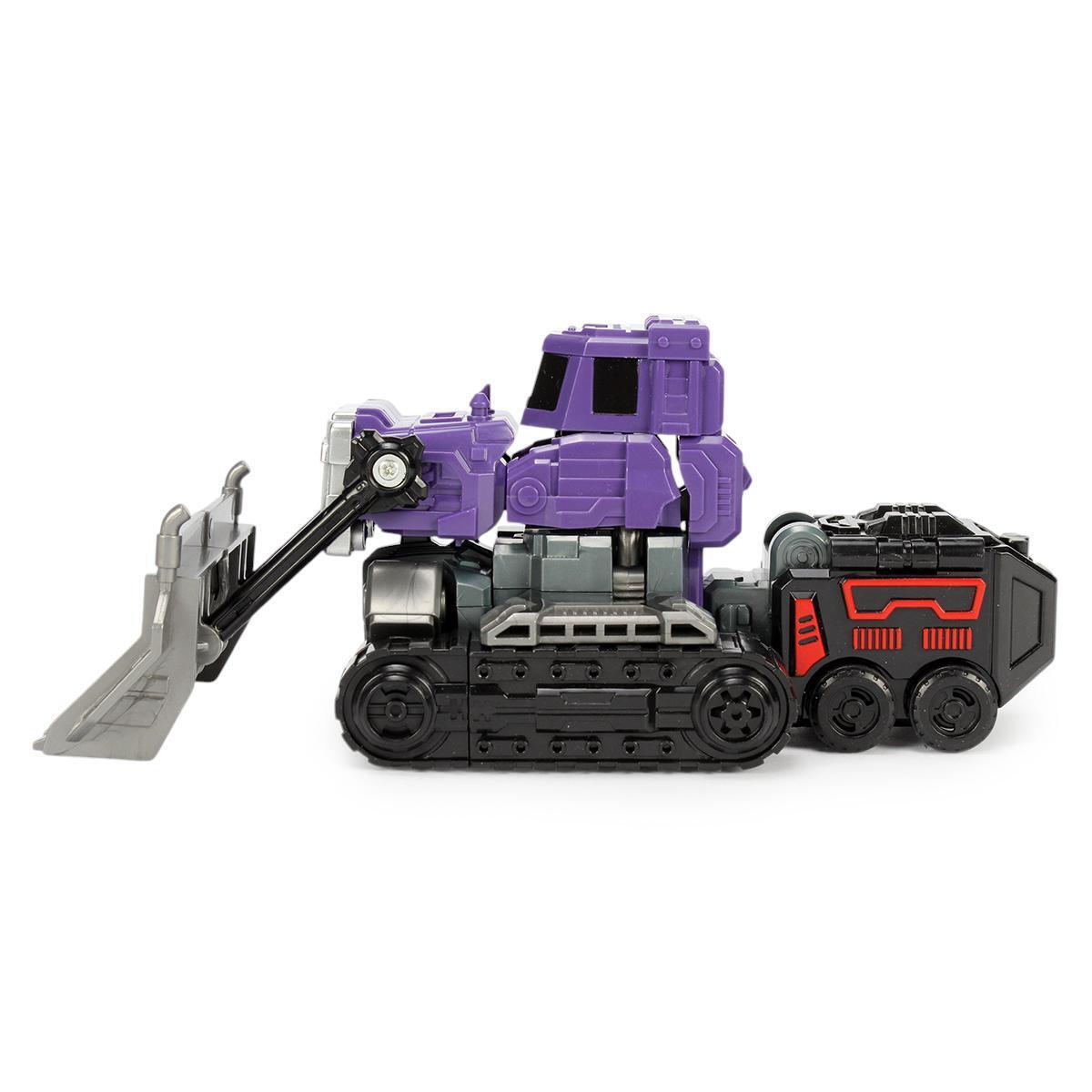 Трансформер выполнен в фиолетовом цвете с серыми и черными элементами, что делает его стильным и современным. Он имеет подвижные части, такие как ковш, который можно поднимать и опускать, что добавляет реалистичности в игру. Упаковка игрушки также содержит информацию о возрасте, начиная с 3 лет, что подтверждает ее безопасность для детей.