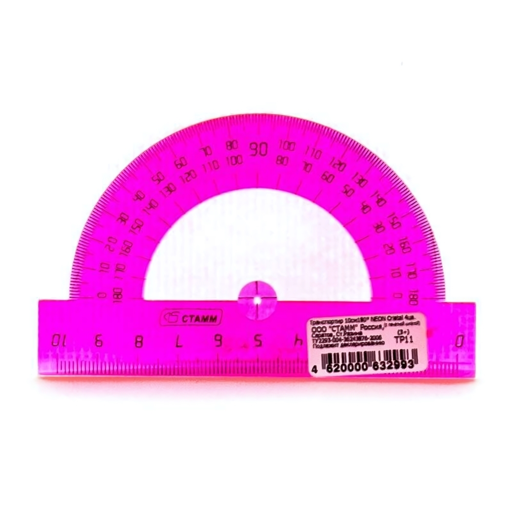 Транспортир «Neon Crystal 4 цвета» от бренда СТАММ сочетает функциональность и безопасность. Прозрачный пластик с яркой неоновой палитрой делает работу с чертежами удобной, а четкая шкала гарантирует профессиональную точность.