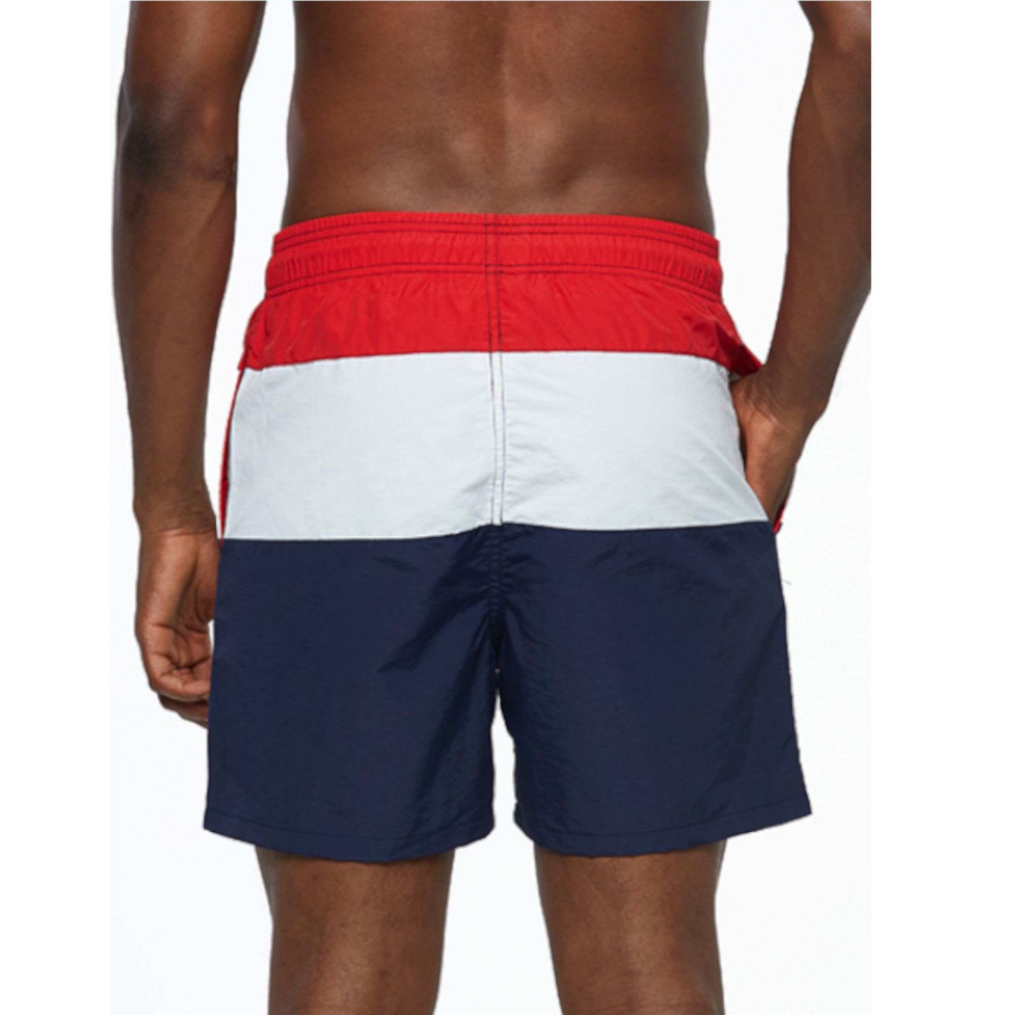 Длина шорт — примерно 40 см, ширина пояса регулируется шнурком, материал — легкий, синтетический, устойчив к воздействию воды и солнца. Размер: M, цвет — разноцветный с тремя цветными полосами. Отличный выбор для активного отдыха и плавания.