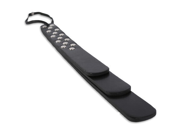 Трехуровневая шлепалка из натуральной кожи черного цвета — аксессуар, сочетающий надежность и стиль. Металлические заклепки обеспечивают долговечность, а эргономичная ручка — комфортный хват для точного контроля интенсивности.