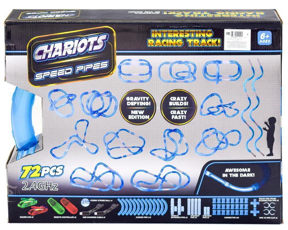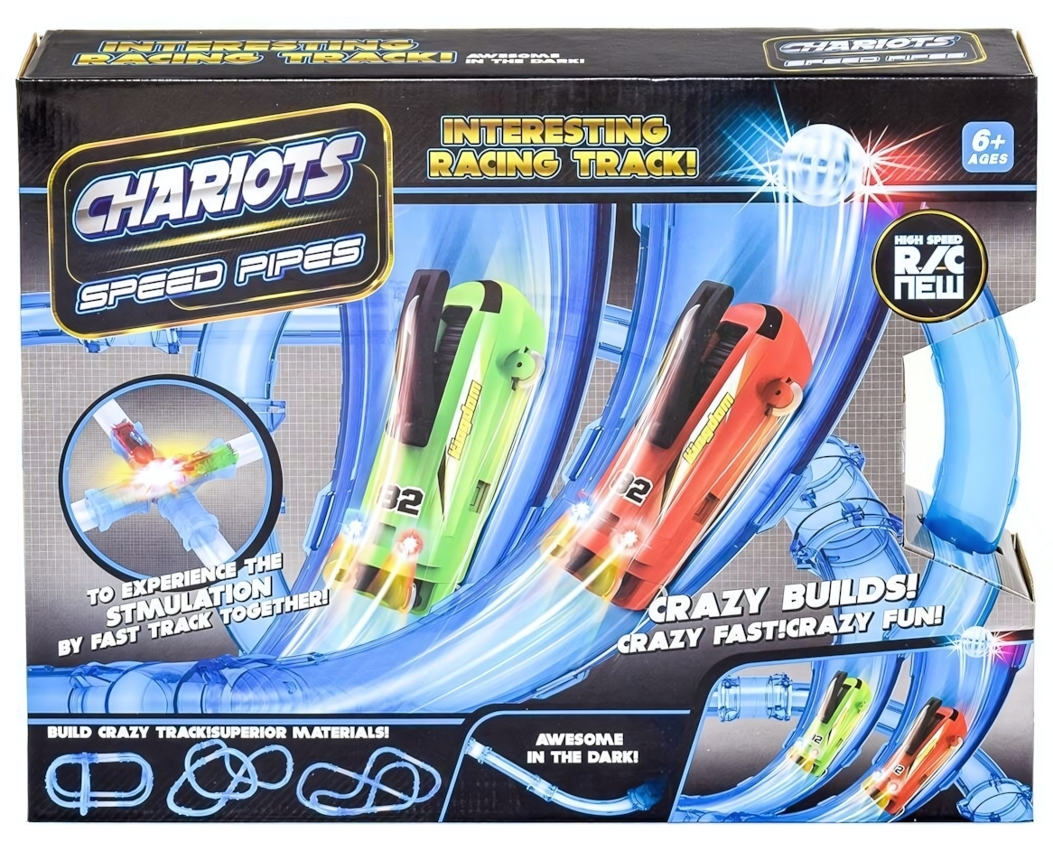 Гоночный трек «Chariots Speed Pipes» с 2 машинками, светящийся в темноте, 72 детали, USB-зарядка, пластик