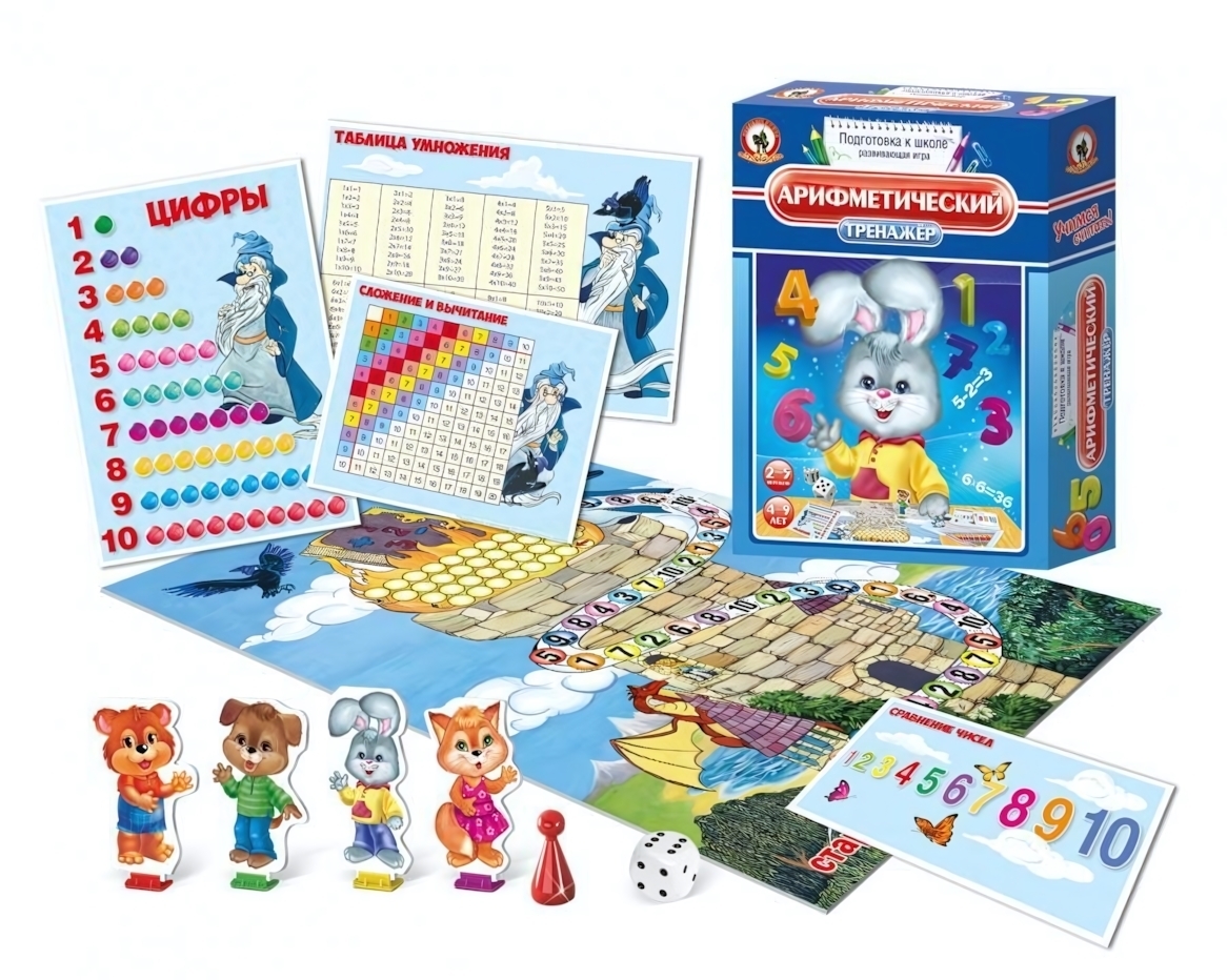 В комплект игры входят: игровое поле, кубик, 5 фишек и правила игры. Все элементы выполнены из безопасных материалов: бумаги, картона и пластмассы. Яркий дизайн и красочные иллюстрации привлекают внимание детей и способствуют их интересу к обучению. Тренажёр «Арифметический» — это не просто игра, а целый мир знаний, который поможет вашему ребенку уверенно шагнуть в мир математики.