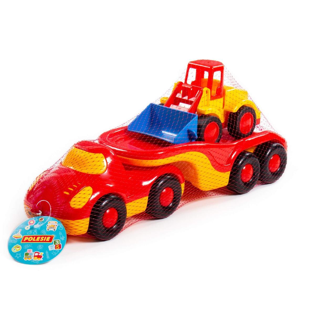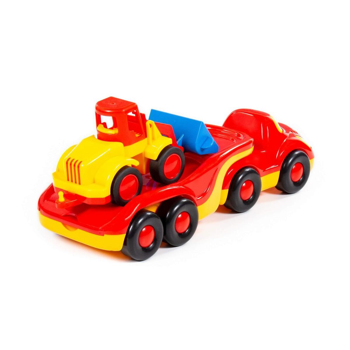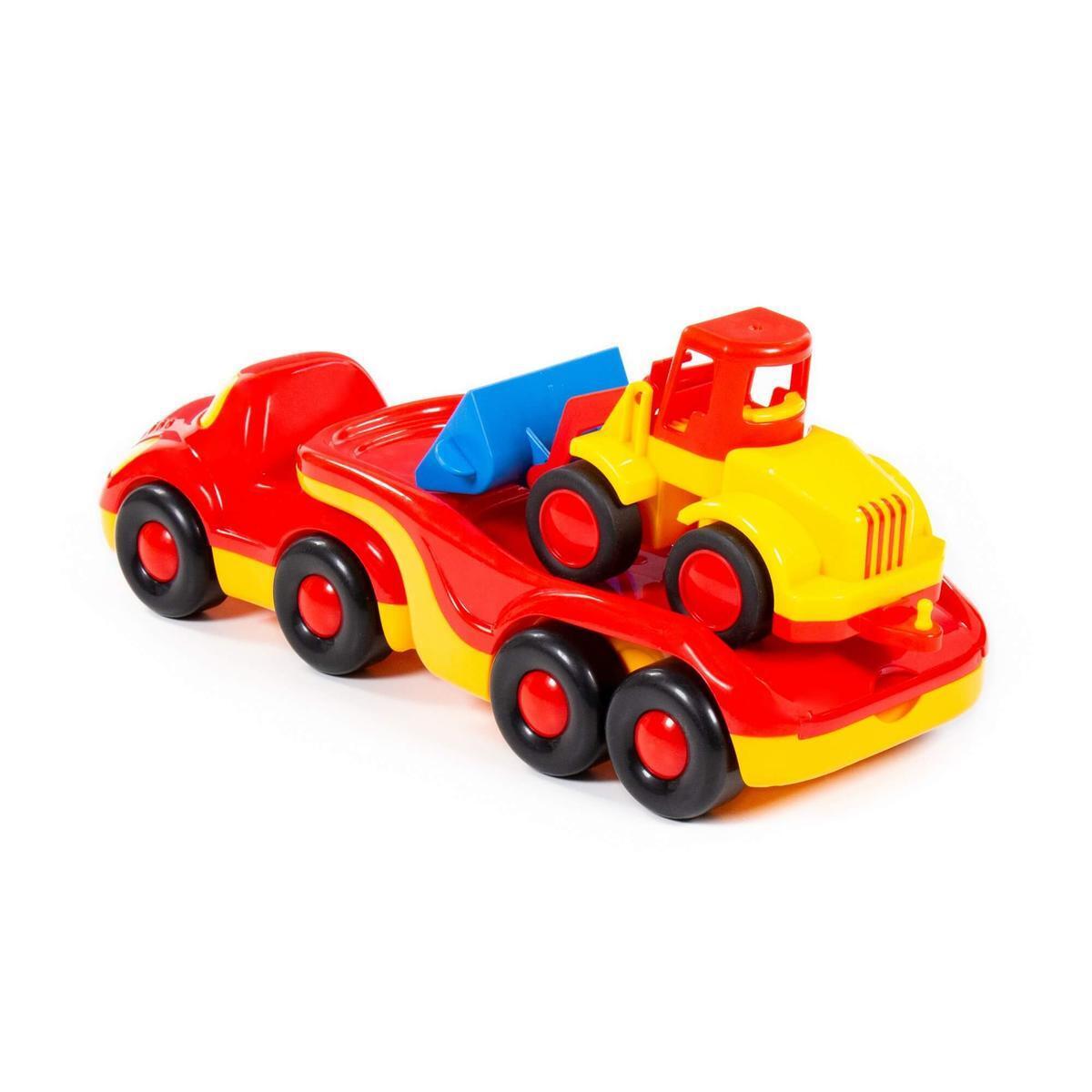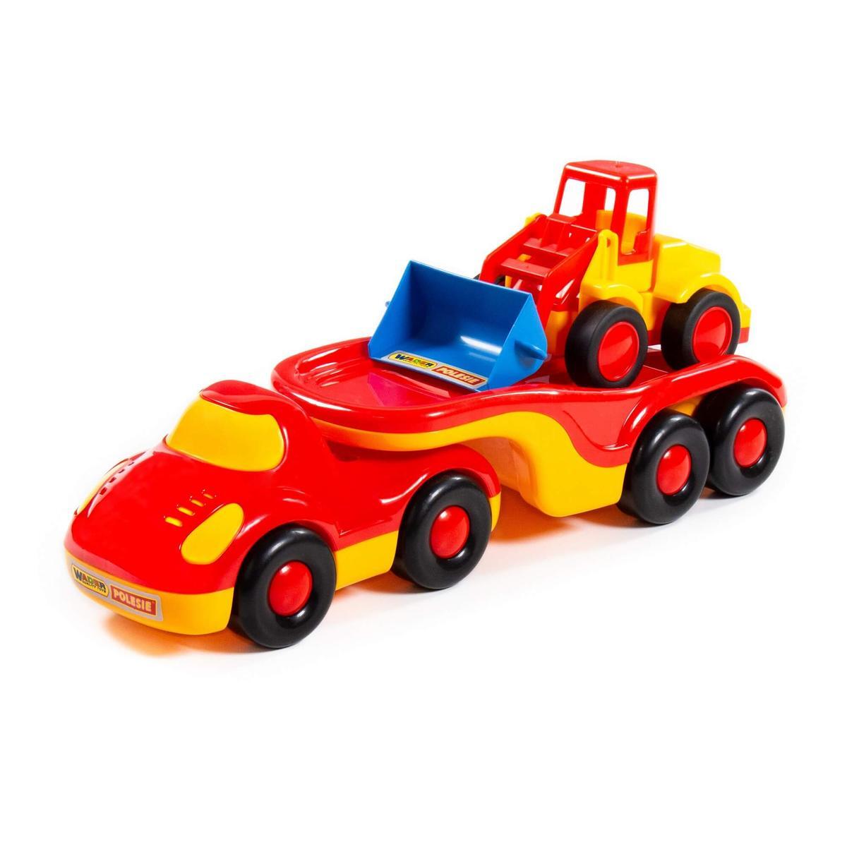 Игрушечный трейлер и погрузчик выполнены в красном, желтом и синем цветах, что делает их визуально привлекательными. Размеры игрушек не указаны, но они достаточно крупные для удобного захвата детскими руками. Эти игрушки станут отличным подарком для вашего малыша и помогут разнообразить его игры в песочнице или дома.