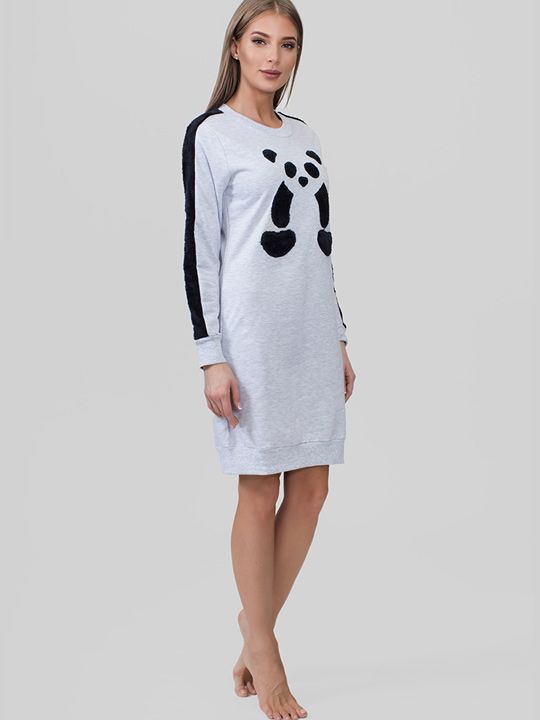 - Яркий и стильный дизайн: Контрастный принт с изображением милой панды на передней части платья добавляет образу игривости и индивидуальности. Это отличный способ поднять настроение себе и окружающим даже в самый обычный день.