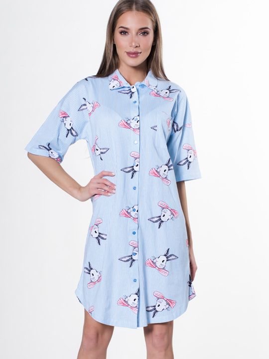 - Стильный дизайн: Нежная голубая основа с тонкими вертикальными белыми полосками визуально вытягивает силуэт. Милый принт с зайцем и розовым бантом добавляет игривую и трогательную нотку образу.