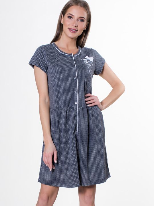 Халат выполнен с застежкой на пуговицы по всей длине передней планки, что делает его удобным в использовании. Укороченный рукав обеспечивает свободу движений и подходит для любого времени года. Отрезная линия талии со сборкой мягко формирует силуэт, добавляя женственности и не сковывая движения.