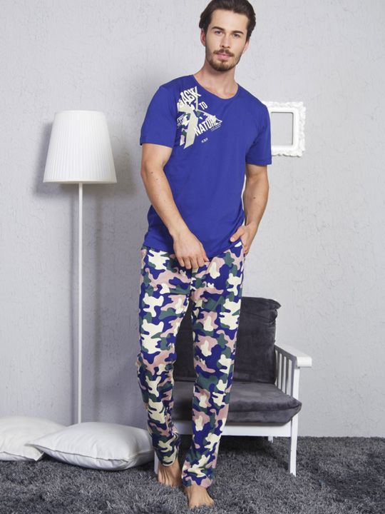 Комплект состоит из футболки с коротким рукавом и длинных брюк прямого кроя. Футболка выполнена в темно-синем цвете и дополнена стильным принтом на груди, что придает образу аккуратность и современный характер. Брюки с камуфляжным узором добавляют динамики и делают домашний образ более выразительным. Такой вариант подойдет как для сна, так и для комфортного времяпрепровождения дома.