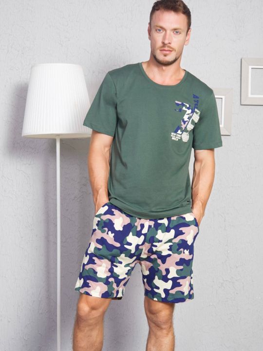 Мужская пижама Vienetta создана для тех, кто ценит удобство, мягкость и свободу движений. Натуральный хлопок приятно ощущается на коже, обеспечивает комфорт во время сна и помогает расслабиться после активного дня. Зеленая футболка с лаконичным принтом и камуфляжные шорты формируют современный, аккуратный образ для дома.