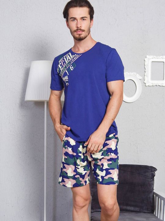 Практичный мужской комплект Vienetta создан для максимального удобства дома, во время отдыха или сна. Мягкий трикотаж приятно прилегает к телу, обеспечивая ощущение легкости и свободы движений. Темно-синяя футболка с аккуратным принтом и камуфляжные шорты выше колена формируют современный и аккуратный образ, в котором комфорт сочетается со стилем.