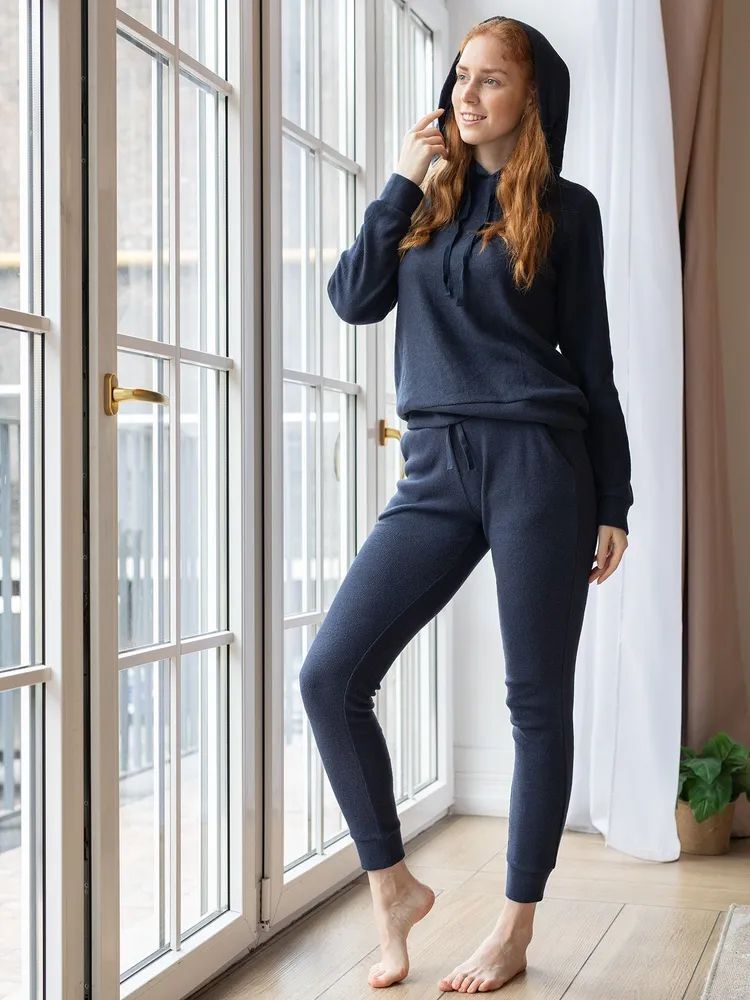 Состав материала (73% полиэстер, 22% вискоза, 5% спандекс) обеспечивает идеальную посадку по фигуре без эффекта «вытягивания». Темно-синий оттенок сохраняет насыщенность цвета после многократных стирок, гармонично сочетаясь с любой домашней обстановкой.