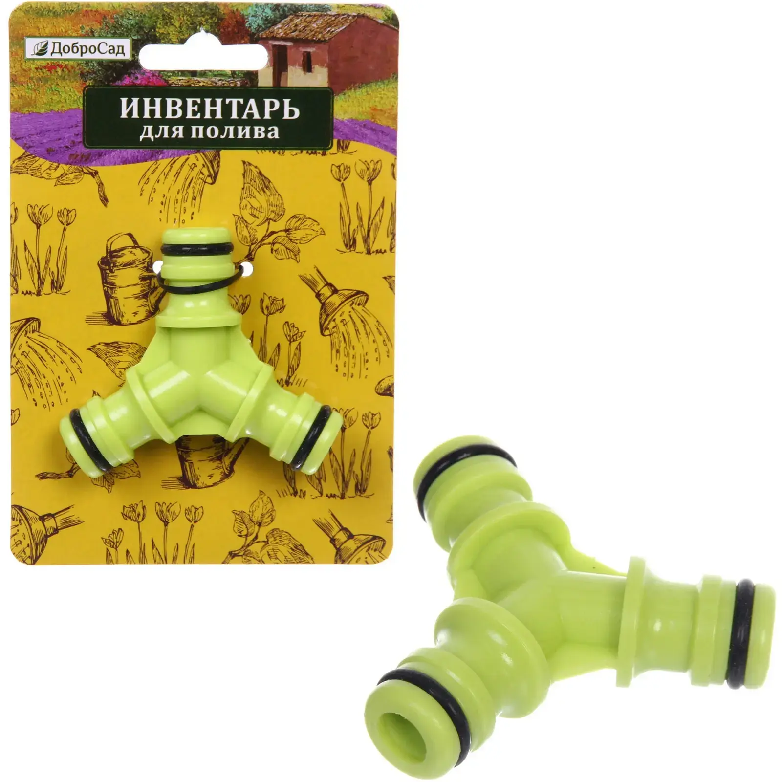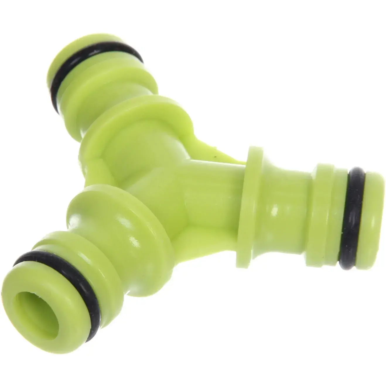 Тройник выполнен в светло-зеленом цвете и имеет три выходных отверстия, каждое из которых оснащено черными резиновыми уплотнителями для герметичности соединений. Этот аксессуар станет отличным дополнением к вашему садовому инвентарю и поможет вам создать эффективную систему полива, которая сэкономит ваше время и усилия.