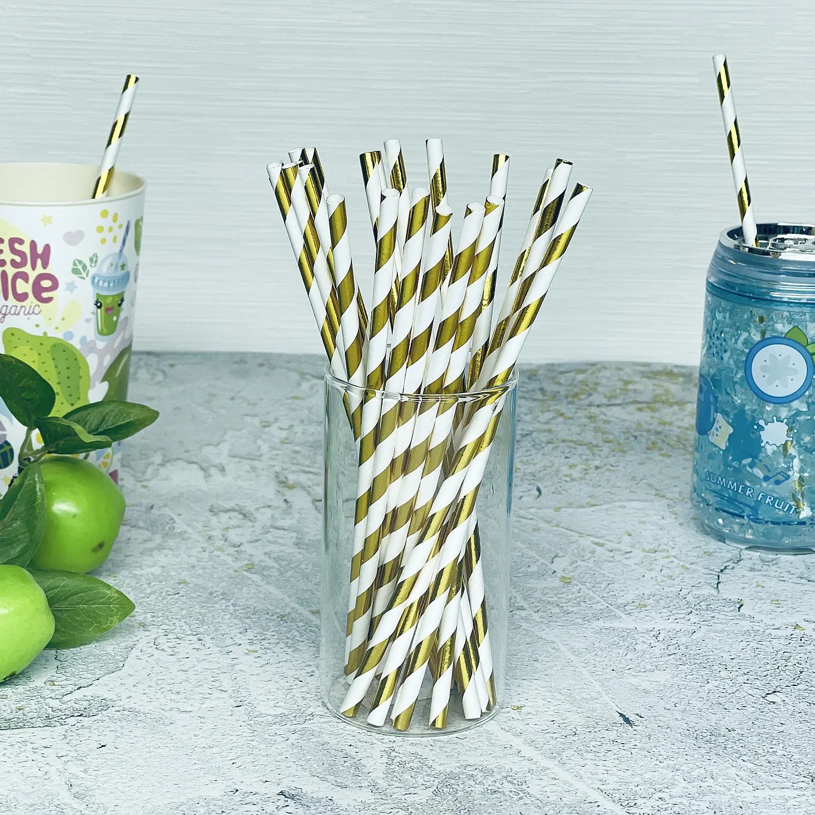 Материал — плотный картон, безопасный для контакта с напитками. Цвет — золото с белым в спиральном оформлении, придающим игривый и праздничный вид. Легко сочетаются с одноразовой и многоразовой посудой, сервировочными аксессуарами и декором в золотых, белых или нейтральных оттенках.