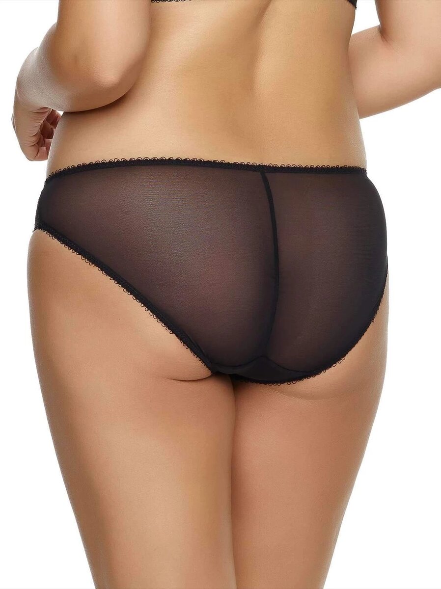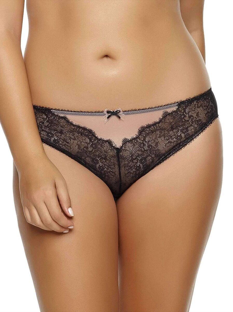 Передняя часть изделия выполнена из черного кружева с цветочным узором, которое элегантно обрамляет верхнюю центральную вставку из полупрозрачного бежевого тюля. Этот дизайн создает эффектную игру текстур и оттенков. Задняя панель изготовлена из полупрозрачного черного тюля со швом посередине, что обеспечивает идеальную посадку и подчеркивает линию фигуры. Ключевая особенность, заботящаяся о вашем здоровье, — ластовица из 100% хлопка, которая обеспечивает необходимый комфорт и гигиену.