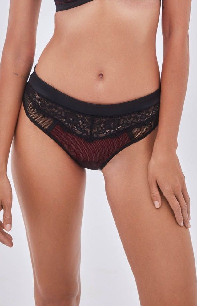 Трусики-бразилиана Heartbeat — это идеальный выбор для тех, кто ценит комфорт и элегантность. Выполненные из роскошного кружева, они обеспечивают не только привлекательный внешний вид, но и невероятное удобство в носке. Сочетание черной сетки с бордовой вставкой придает изделию особый шарм, а эластичный атласный пояс обеспечивает надежную посадку на талии.