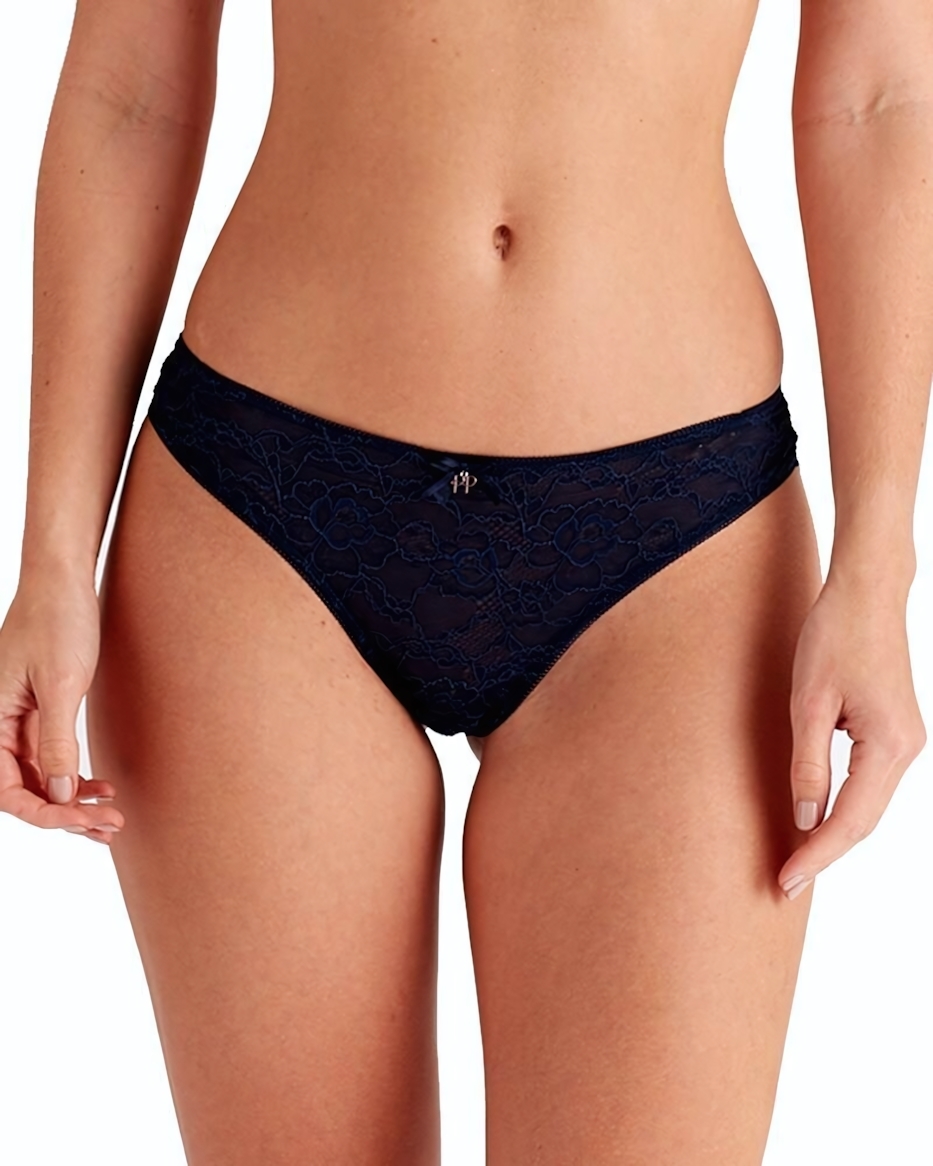 Состав: 86% полиамид (кружево) + 14% эластан для идеальной растяжимости. Цветовая гамма: насыщенный темно-синий с контрастным декором. Размер XS соответствует обхвату талии 65-72 см и бедер 90-97 см (российский 42-44).