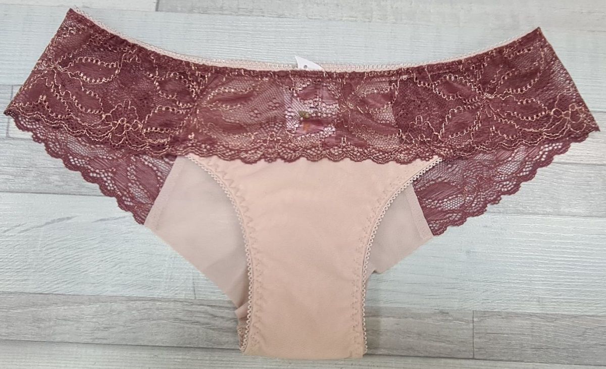 Размер M (европейский 36-38) оптимально подходит для обхвата талии 66-70 см. Светло-бордовый оттенок кружева дополнен нейтральными телесными элементами — идеальное сочетание для любого типа одежды. Особенности кроя: