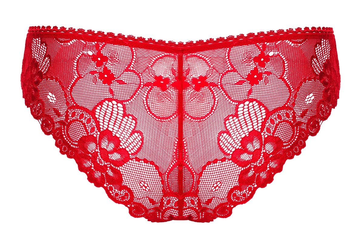 Модель выполнена в насыщенном красном цвете. Задняя часть полностью кружевная с цветочным узором, что делает ее особенно привлекательной. Все края аккуратно обработаны. Для сохранения первоначального вида и качества кружева рекомендуется бережная стирка при температуре до 30°C, без отбеливателей, щадящий отжим и сушка вдали от прямых источников тепла. Глажка при низкой температуре.