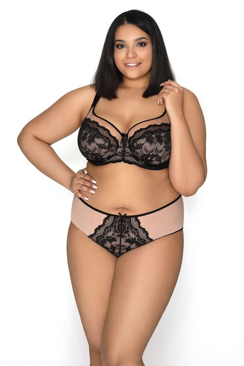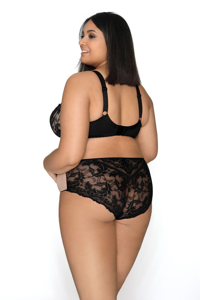 Трусики "Olivia" отличаются уникальным двухцветным дизайном. Основной цвет – нежный бежевый, который создает эффект второго слоя кожи и идеально сочетается с любым оттенком одежды. На передней части расположен выразительный черный кружевной элемент с растительным узором, который становится акцентной деталью и придает модели особую изысканность. Задняя часть полностью выполнена из полупрозрачного черного кружева с таким же растительным рисунком, создавая гармоничный и соблазнительный образ.