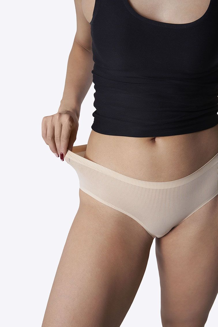 Средняя линия талии с эластичной резинкой мягко поддерживает, не оставляя следов на коже. Низкая посадка модели L (обхват бёдер 100-108 см) создаёт эффект «второй кожи», сохраняя свободу движений в течение всего дня.