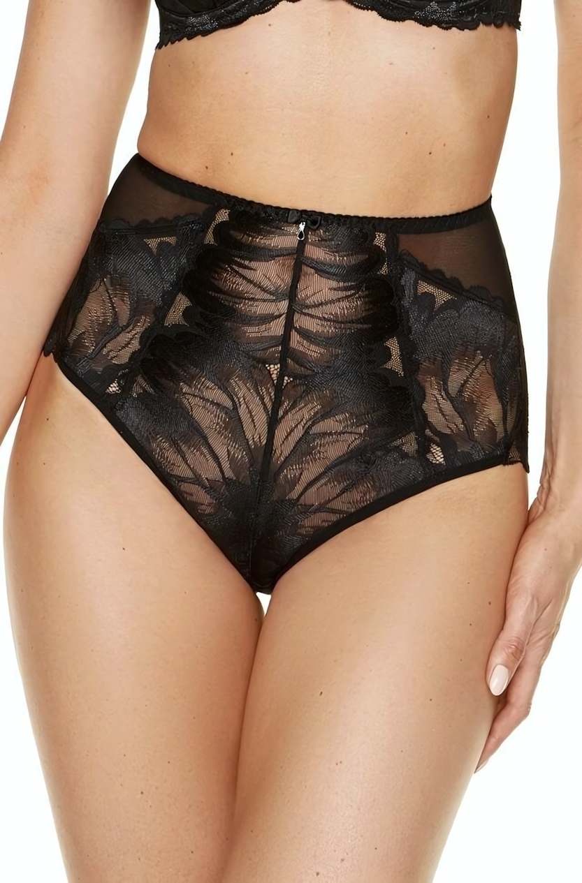 Черные трусики-слипы Moon с высокой линией талии созданы для тех, кто ценит женственность и удобство. Изящное сочетание гипюра с цветочным рисунком и сетки подчеркнет вашу индивидуальность.