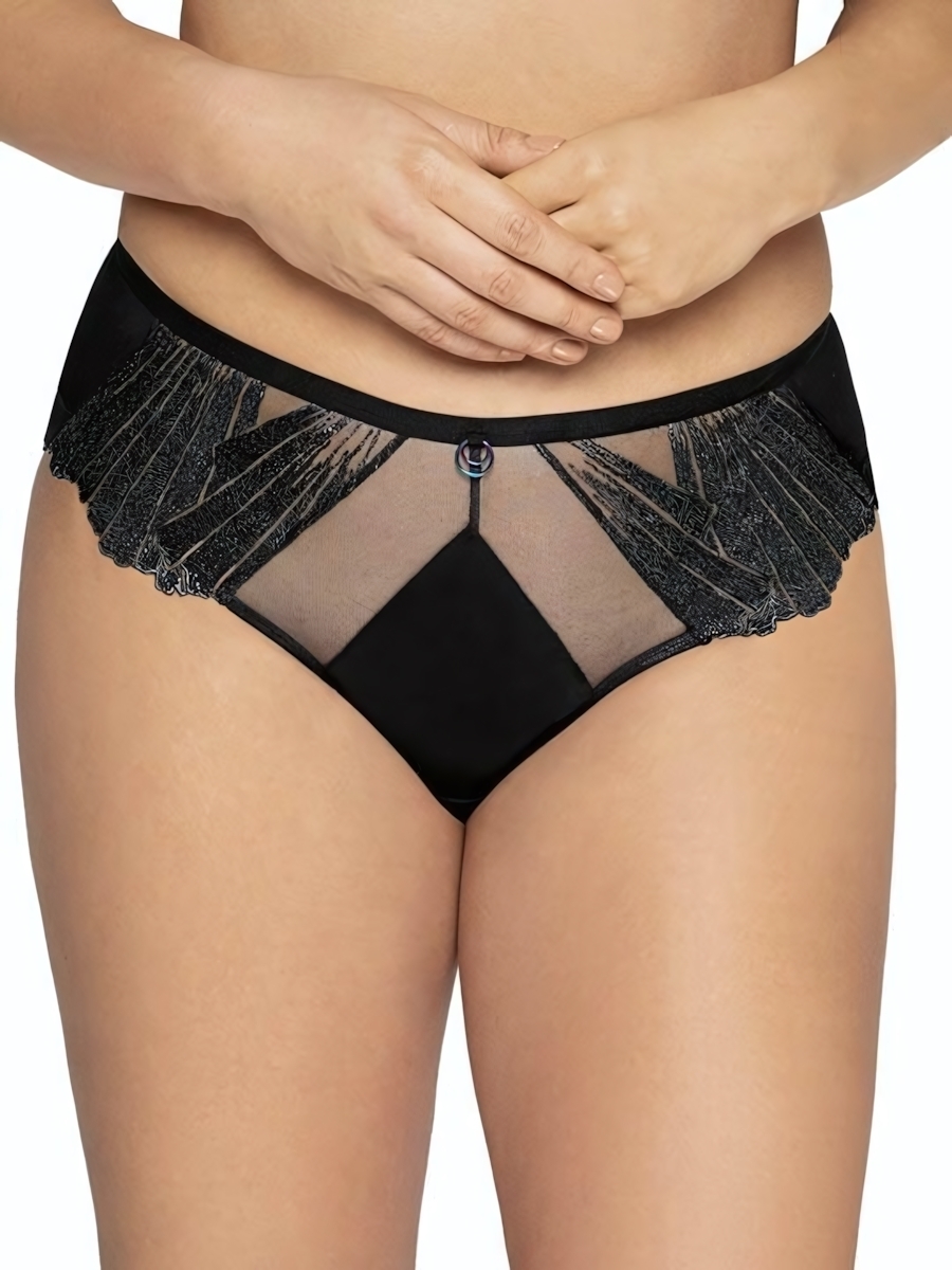 Эти трусики-слипы черного цвета с блестящей отделкой обеспечивают идеальное сочетание комфорта и стиля. Они созданы для женщин, которые ценят качество и элегантность в своем нижнем белье. Благодаря средней линии талии и среднему бочку, трусики идеально сидят на фигуре, подчеркивая женственные линии.