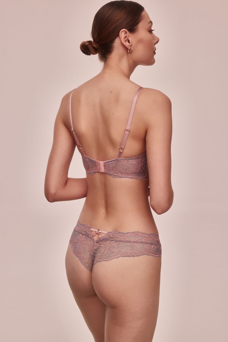 Кружевные детали с контрастной вышивкой сохраняют форму после многократных стирок, а плоские швы предотвращают натирание. Состав ткани (40% полиамид, 30% вискоза, 20% эластан, 10% хлопок) обеспечивает воздухопроницаемость и долговечность. Стильный бантик на спинке добавляет ноту игривости в лаконичный дизайн.