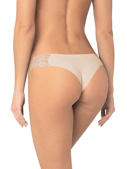 Трусики-бразилиана Amoret незаметные под одеждой, V-образная посадка, кружево, микрофибра, размер S, бежевый