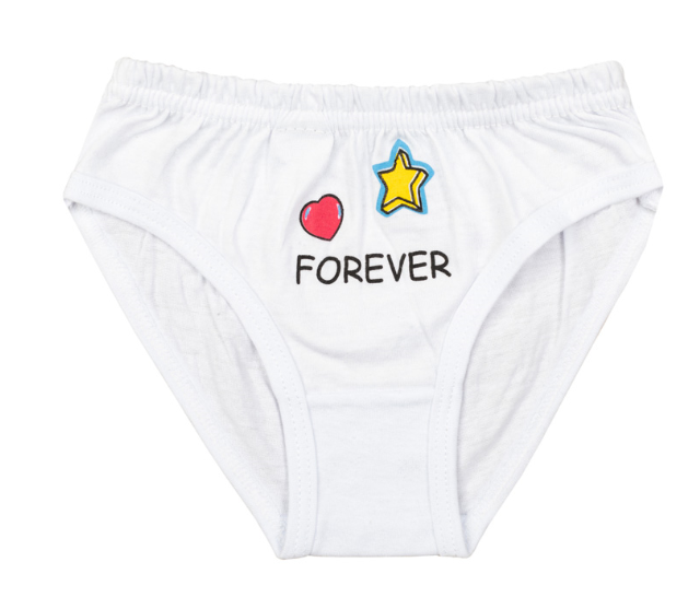 Белая ткань украшена яркими элементами — милым красным сердцем, солнечной жёлтой звездой и надписью «FOREVER» в мультяшном стиле. Такая расцветка делает модель привлекательной и добавляет радости в каждый день.