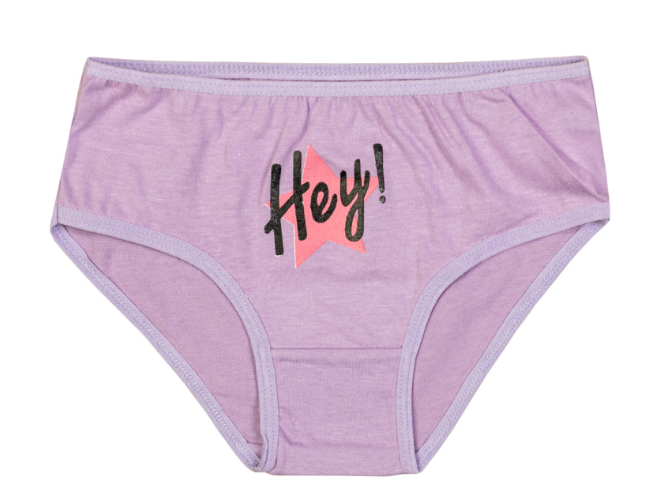 Размер: 110 см. Цвет сиреневый. Принт на передней части — чёрный текст "Hey!" и розовая звезда. Отгружается одна пара трусов.