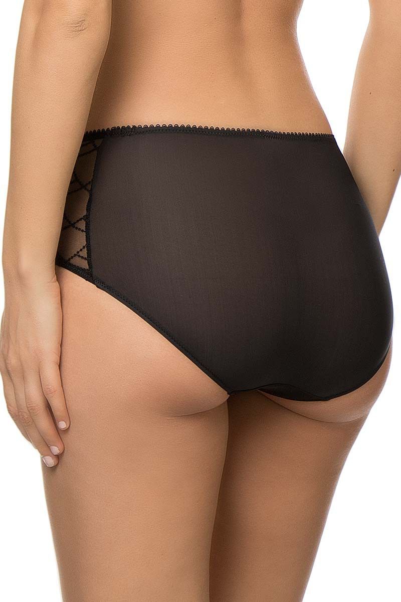 Передняя часть украшена аккуратной драпировкой по центру, которая визуально вытягивает силуэт и добавляет изящества. Боковые вставки из вышитого тюля создают ощущение легкости и придают модели утонченный характер. Задняя часть выполнена из гладкой, приятной к телу ткани, благодаря чему трусы комфортны в повседневной носке и подходят для длительного использования.