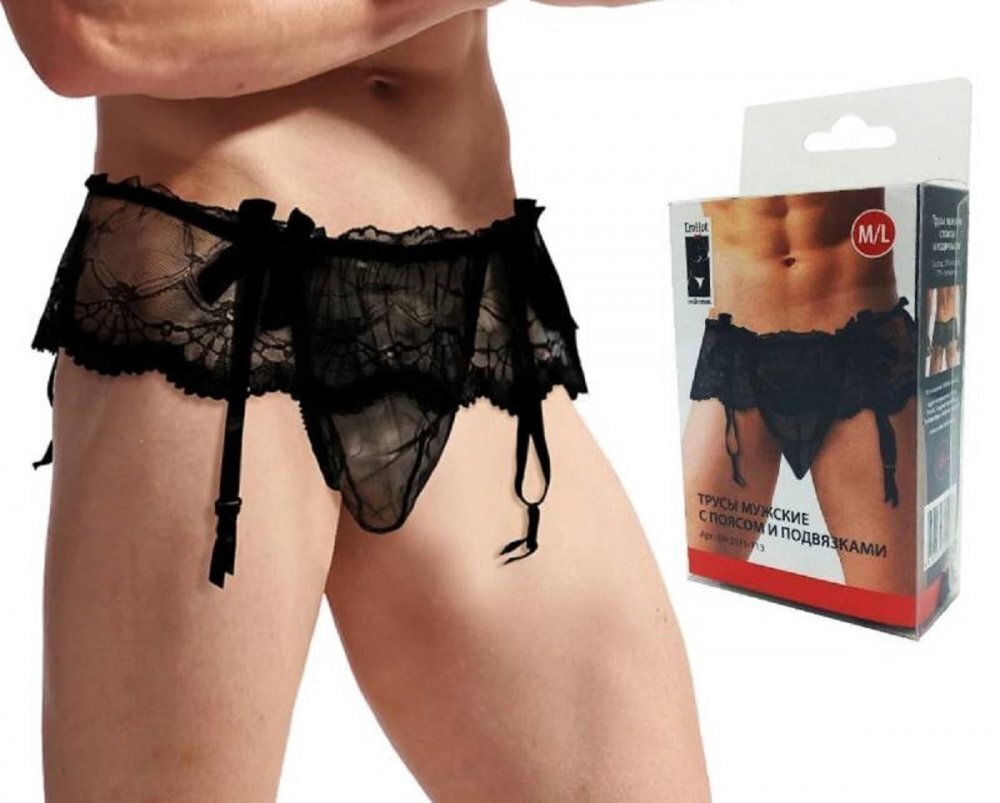 Трусы мужские кружевные с поясом и подвязками, черные, размер M/L