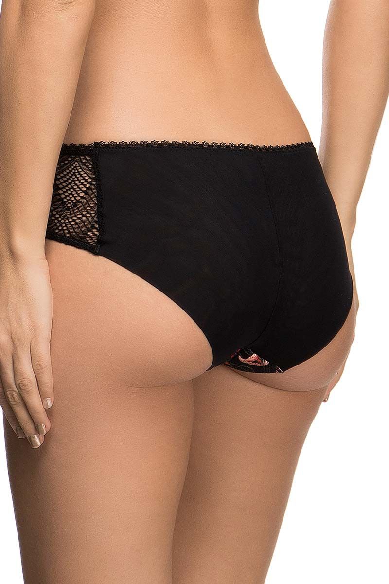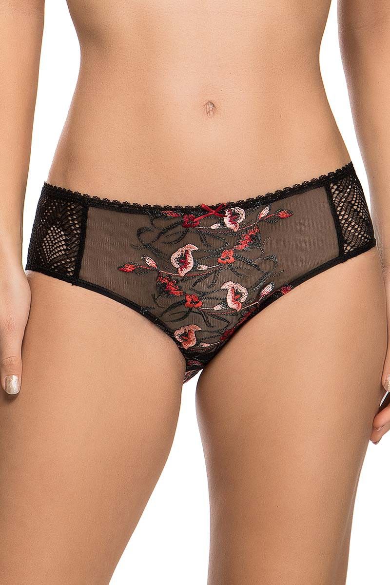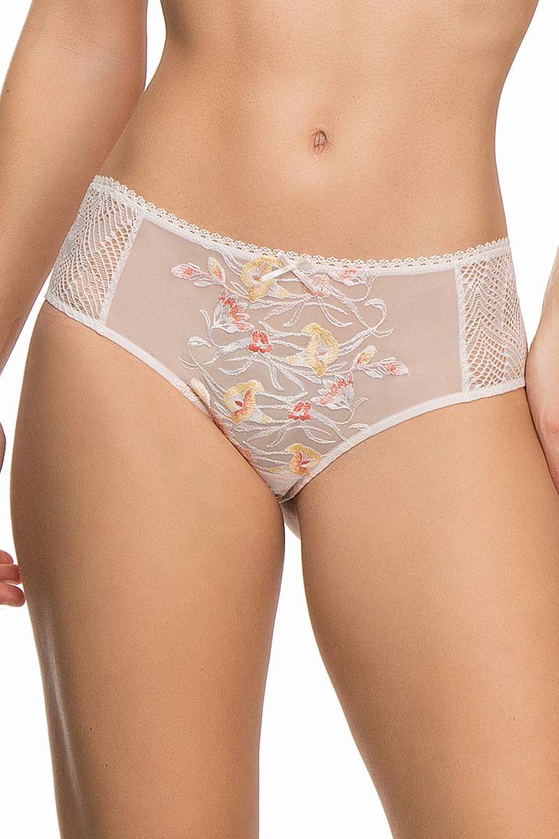 Передняя часть выполнена из тонкого тюля с декоративной вышивкой, которая добавляет модели выразительности. Боковые кружевные вставки визуально облегчают силуэт и делают модель особенно женственной. Задняя часть из гладкой непрозрачной ткани обеспечивает комфорт и уверенную посадку.