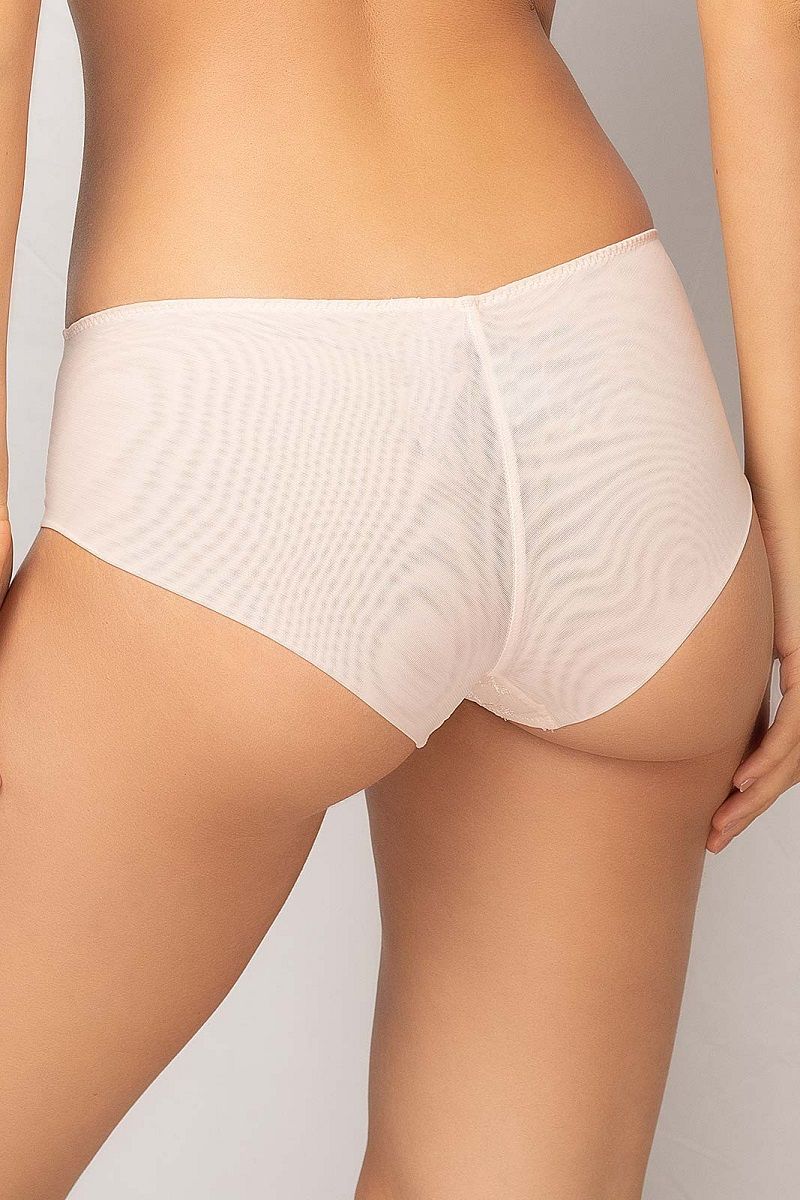 Передняя часть выполнена из тонкой сетки с вышитым узором, который добавляет образу выразительности и женственности. Боковые вставки из кружева и аккуратная отделка по краю создают мягкий силуэт без излишнего давления на кожу. Формат шорт обеспечивает более закрытую и комфортную посадку по линии бедер, что особенно удобно для ежедневного ношения.