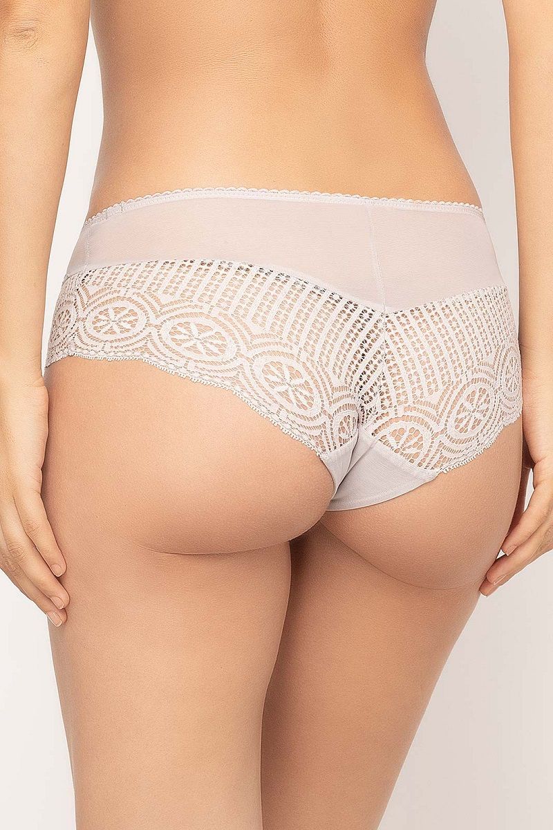 Модель выполнена в формате шорт, что обеспечивает более закрытую и комфортную посадку по сравнению с классическими трусиками. Полупрозрачная сетчатая вставка на поясе визуально облегчает силуэт, а фестончатые края создают аккуратный и женственный контур. Небольшой декоративный бант спереди добавляет деликатный акцент.