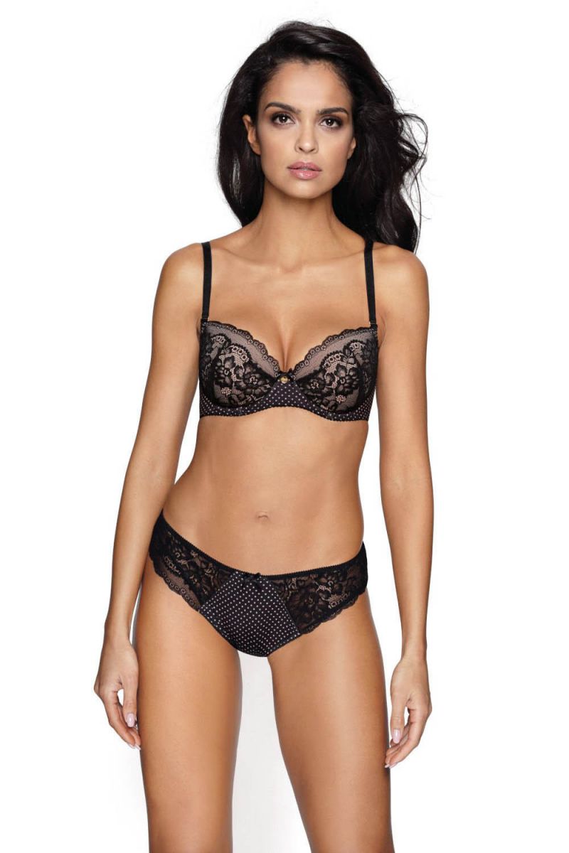 - Кружевные вставки: по бокам и верхнему краю расположены изящные кружевные элементы черного цвета, добавляющие модели женственности и воздушности.