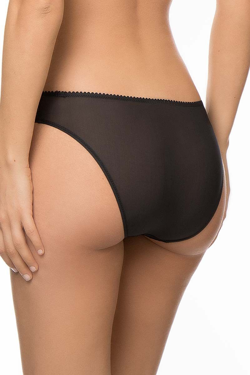 Передняя часть дополнена ажурной сетчатой вставкой с вышивкой и декоративным металлическим кольцом по центру пояса. Такие элементы делают модель выразительной, сохраняя баланс между комфортом и чувственностью. Трусы-слипы подходят как для повседневной носки, так и для особых случаев, легко сочетаются с бюстгальтером в аналогичном стиле.