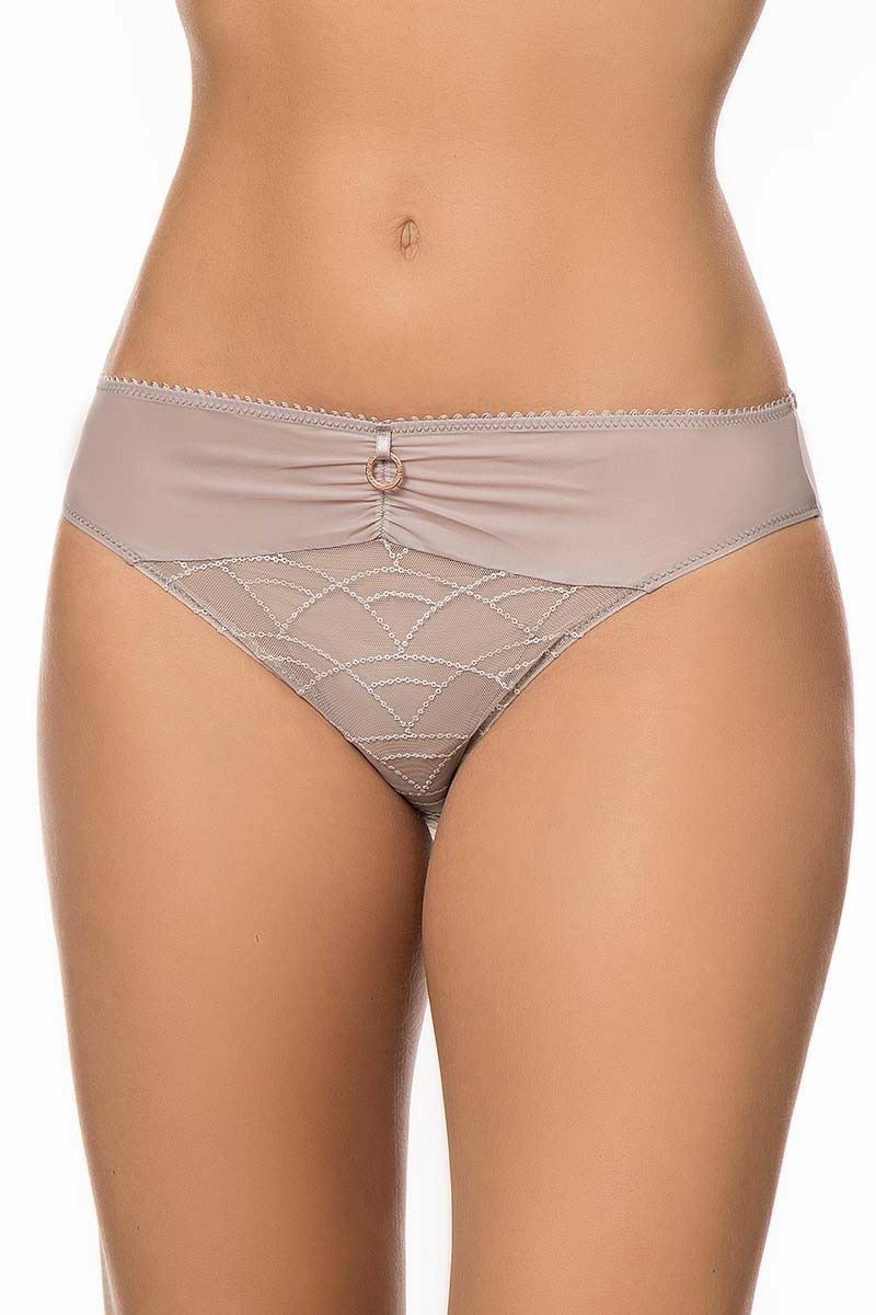 Высокий вырез визуально удлиняет ноги и обеспечивает удобную посадку. Передняя часть дополнена полупрозрачной сетчатой вставкой с изящной вышивкой в виде пересекающихся дуг, создающих аккуратный геометрический орнамент. По центру пояса расположено декоративное металлическое кольцо, а верхний край украшен фестончатой тесьмой, что придаёт модели завершённый и аккуратный вид.