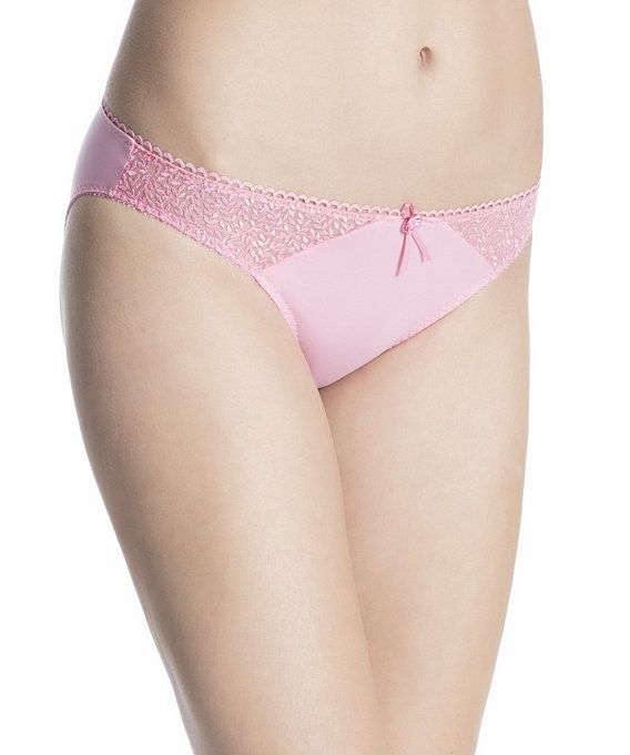 Модель выполнена с высоким вырезом по линии бедер, что визуально удлиняет ноги и делает силуэт более изящным. Передняя и задняя части из гладкой непрозрачной ткани дарят ощущение мягкости, а боковые кружевные вставки добавляют легкость и женственность. Фестонная обработка по верхнему краю и аккуратный бантик по центру пояса подчеркивают внимание к деталям.
