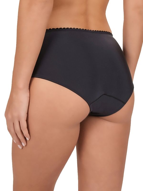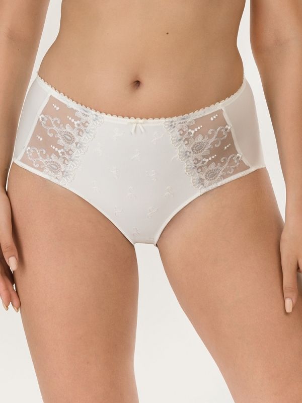 Передняя часть выполнена из гладкой ткани с боковыми кружевными вставками с орнаментальным узором. Фестончатый край пояса и небольшой декоративный бантик добавляют женственности. Задняя часть полностью закрывает ягодицы, обеспечивая уверенную и комфортную посадку без лишнего объема под одеждой.